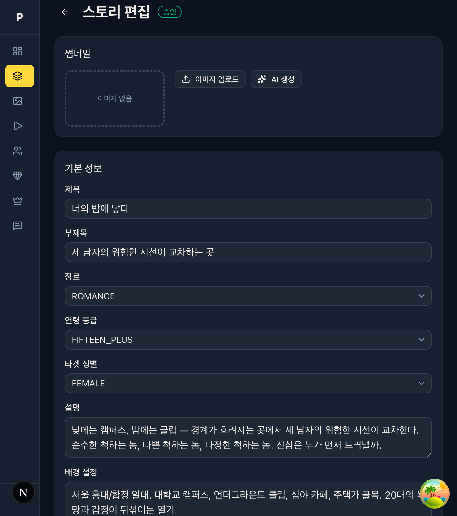 AI 캐릭터 채팅 플랫폼은 콘텐츠가 곧 상품이다. 스토리 하나를 만들려면 세계관, 캐릭터 4~5명의 페르소나와 말투, 에피소드별 이벤트 체인, 분기 조건을 모두 채워야 한다. 토크룸도 마찬가지다. 테마에 맞는 캐릭터를 배치하고, 인사말과 대화 설정을 작성해야 한다.