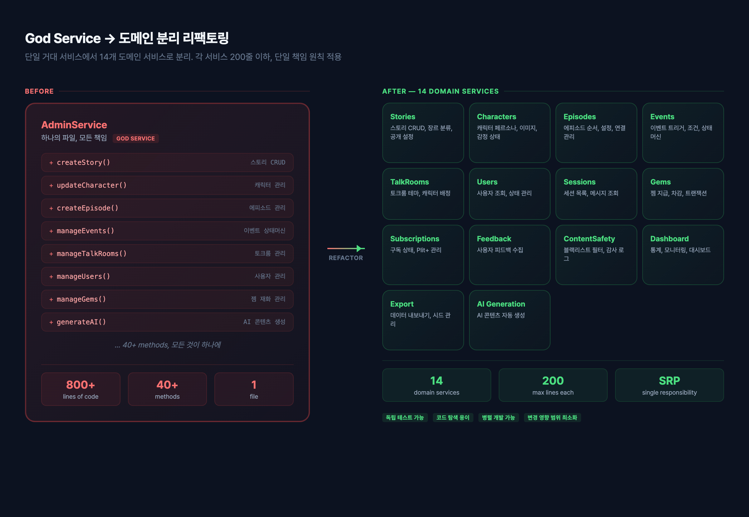 프로젝트 초기에는 AdminService 하나가 스토리 CRUD, 캐릭터 관리, 세션 조회, 유저 관리, AI 생성까지 전부 담당했다. 200줄을 넘기기 시작하자 문제가 분명해졌다.