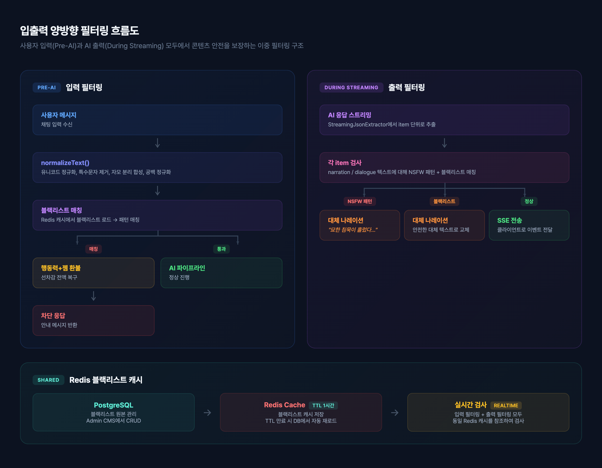 출력 필터에서 주목할 점은 **action이 'blocked'가 아니라 'replaced'**라는 것이다. 입력은 완전히 차단하지만, 출력은 대체 나레이션("묘한 침묵이 흘렀다.")으로 교체하여 대화 흐름을 유지한다. 사용자 입장에서는 자연스러운 나레이션 하나가 삽입될 뿐, 필터링이 발생했다는 사실을 노골적으로 인지하지 못한다.