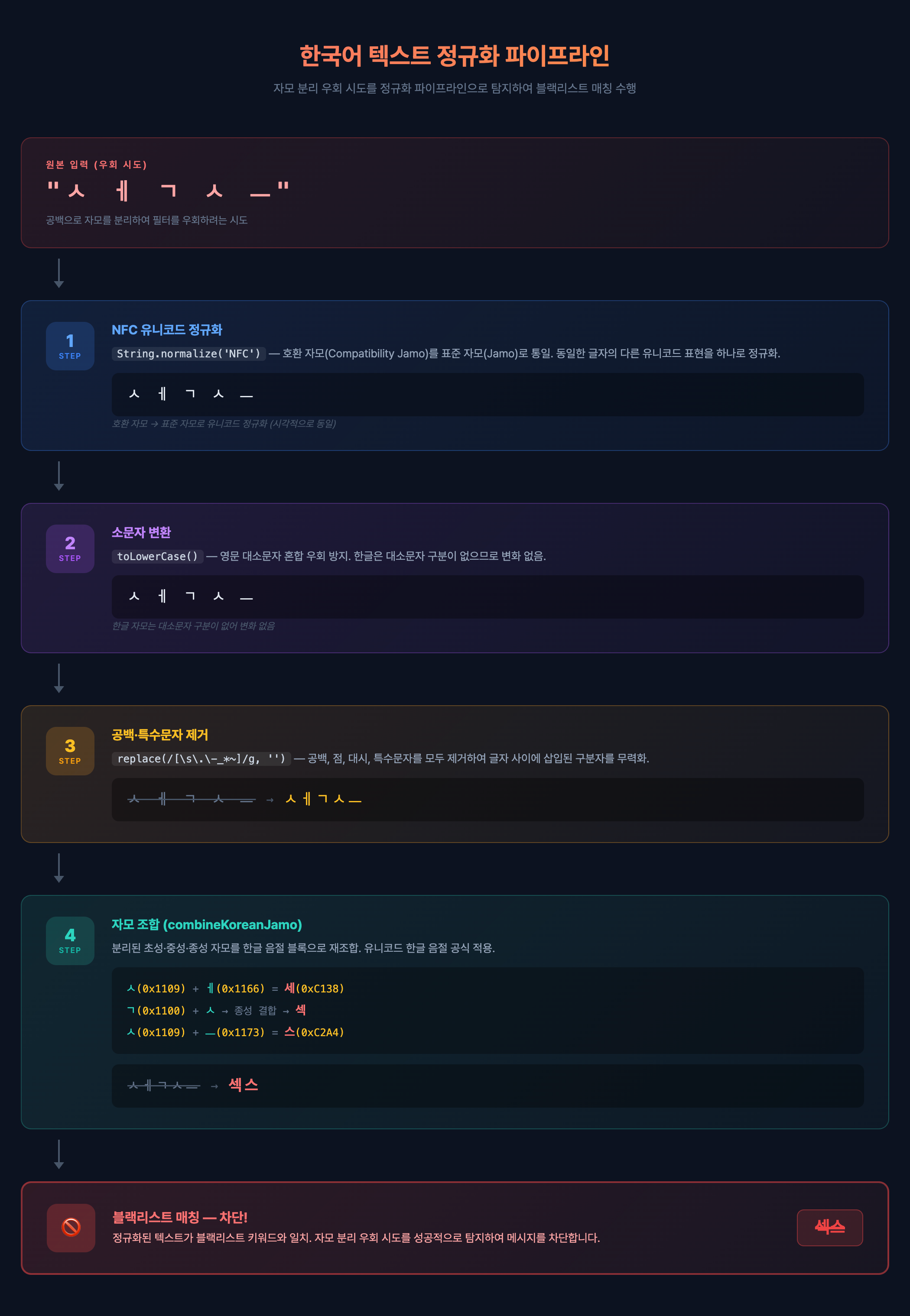 블랙리스트에는 원본 형태("섹스")만 등록하면 된다. 정규화가 양쪽 모두에 적용되므로 "ㅅㅔㄱㅅㅡ"든 "섹 스"든 모두 잡아낸다.
