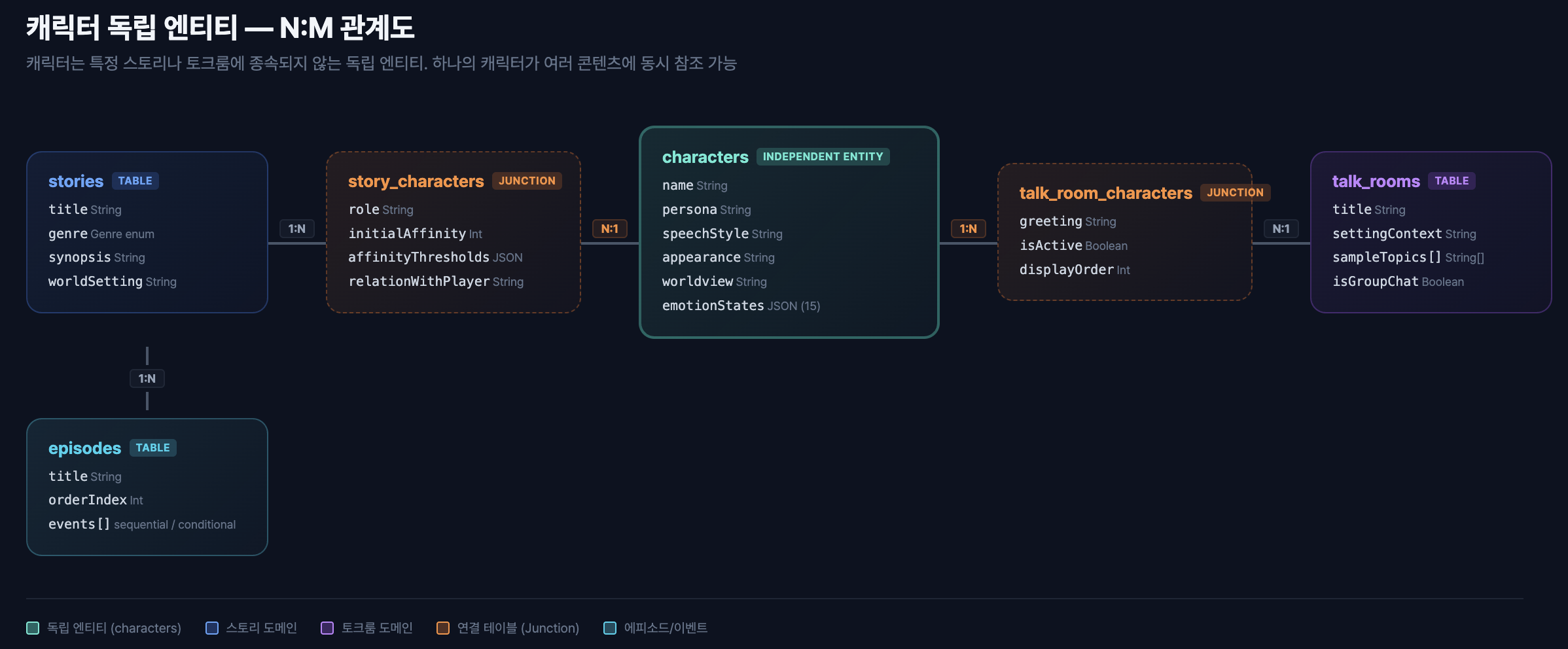 캐릭터 원본(페르소나, 말투)은 characters 테이블에, 맥락(스토리에서의 역할, 초기 호감도)은 story_characters 연결 테이블에 저장한다. 이 분리 덕분에 하나의 캐릭터가 스토리에서는 라이벌이면서, 토크룸에서는 친근한 상담자 역할을 수행할 수 있다.